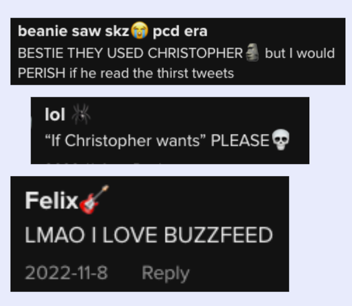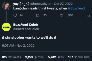 When someone asked for the leader, Bang Chan, to read thirst tweets, I replied with an in-joke that fans instantly recognized. It made BuzzFeed Celeb sound like it was run by a fellow STAY (that’s a Stray Kids fan, for the unfamiliar)