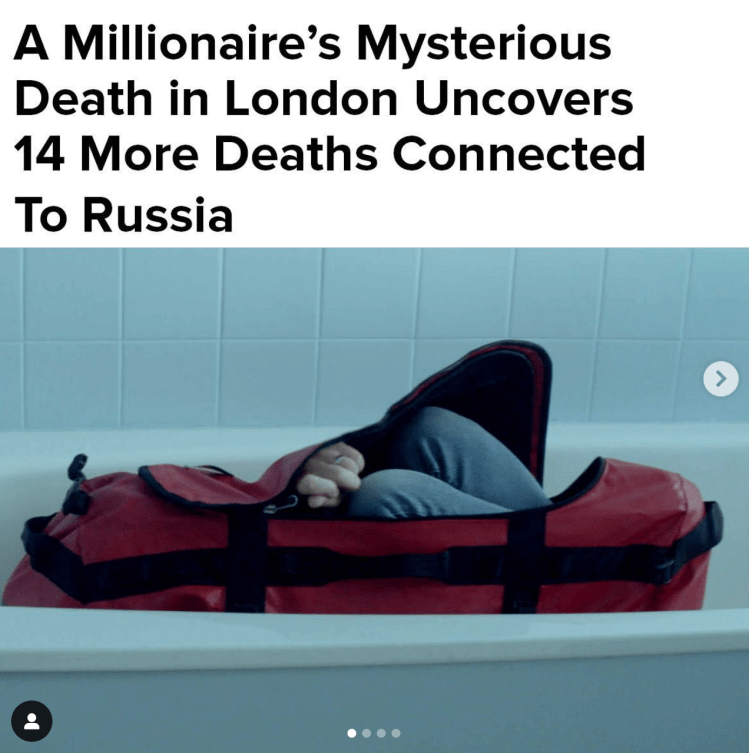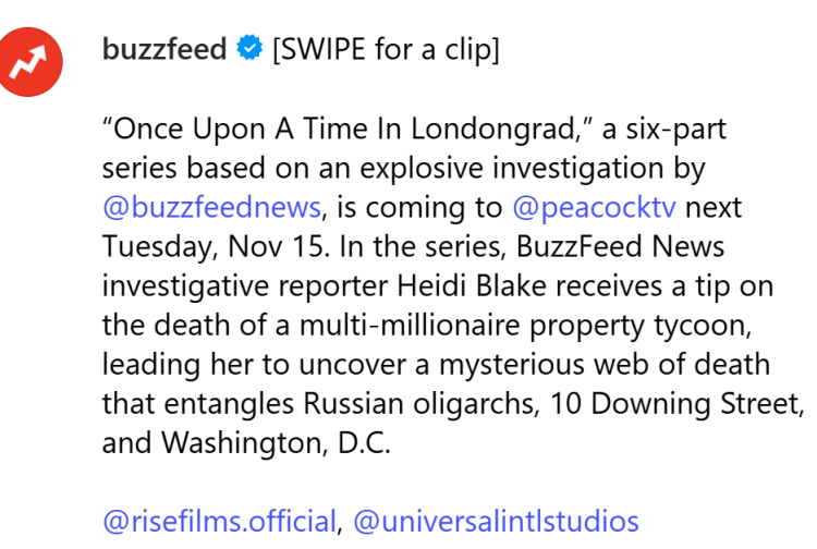 BuzzFeed Studios and Peacock wanted to promote its 6-episode documentary (Once Upon a Time in Londongrad) by publishing promo stills and a clip on BuzzFeed’s Instagram.